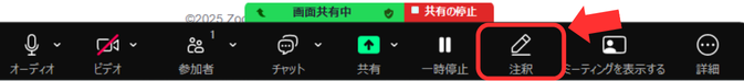 画面共有の表示までできたら、画面の上にポインターを持っていくと↓のようにツールバーが表示されますので、その中にある「注釈」をクリックします。