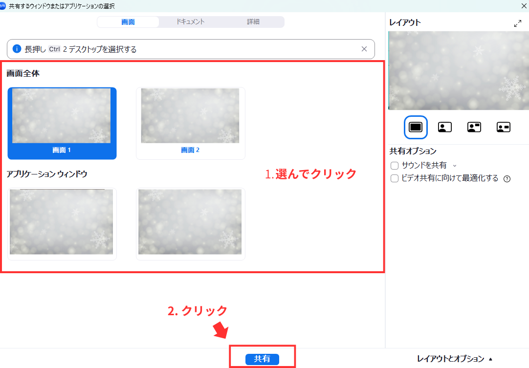 すると↓の画面が出てきますので赤枠内から共有したい画面を選択しクリックします。
